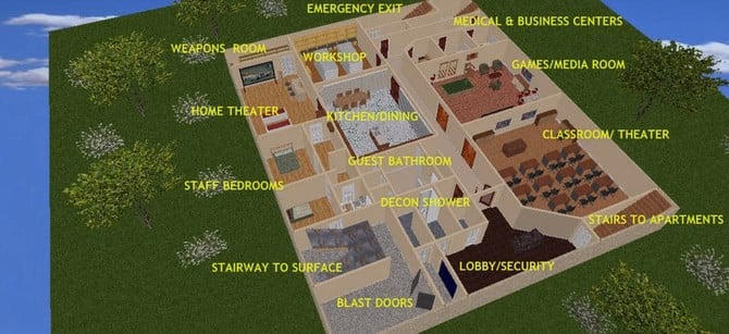 Nằm trên khu đất rộng 32 mẫu Anh, hầm trú ẩn có hai tầng và diện tích khoảng 14.000 feet vuông.Tầng một bao gồm các khu vực chung và khu dành cho nhân viên trong khi tầng hai có bốn căn hộ. Mỗi căn hộ đều có nhà bếp, khu vực ăn uống, 2 phòng ngủ, phòng khách và phòng tắm, phòng chơi game, phòng đọc sách. Có đủ nước nóng, điện năng thiên nhiên và bộ điều khiển độ ẩm.