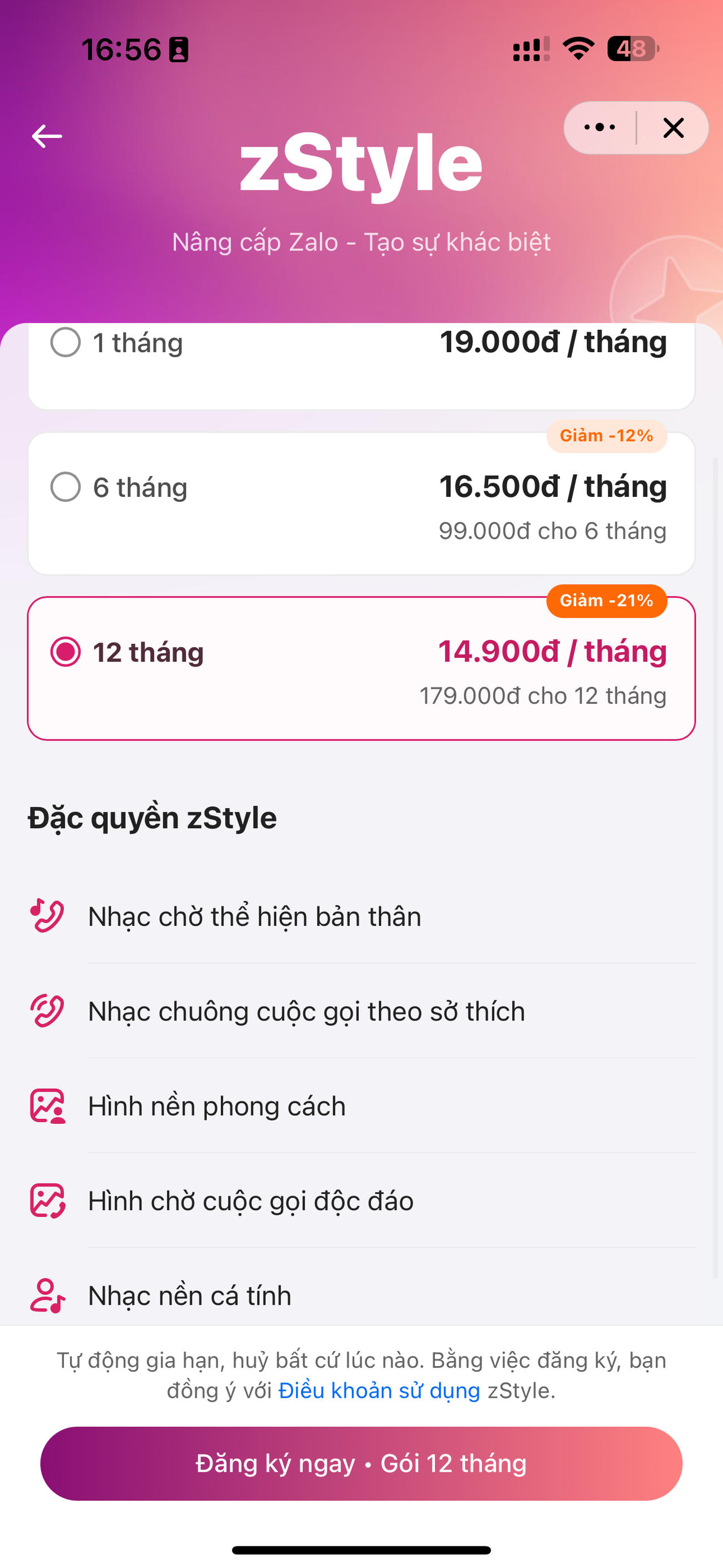 Cùng với đó, nếu người dùng sử dụng gói Zstyle tạo sự khác biệt với đặc quyền là nhạc chờ, nhạc chuông cuộc gọi theo sở thích, hình nền phong cách , hình chờ cuộc gọi độc đáo, nhạc nền cá tính thì có mức phí áp dụng như sau: gói 1 tháng là 19.000 đồng/tháng; 6 tháng được giảm 12% còn 99.000 đồng/ 6 tháng; 1 năm được giảm 21% còn 179.000 đồng/12 tháng.