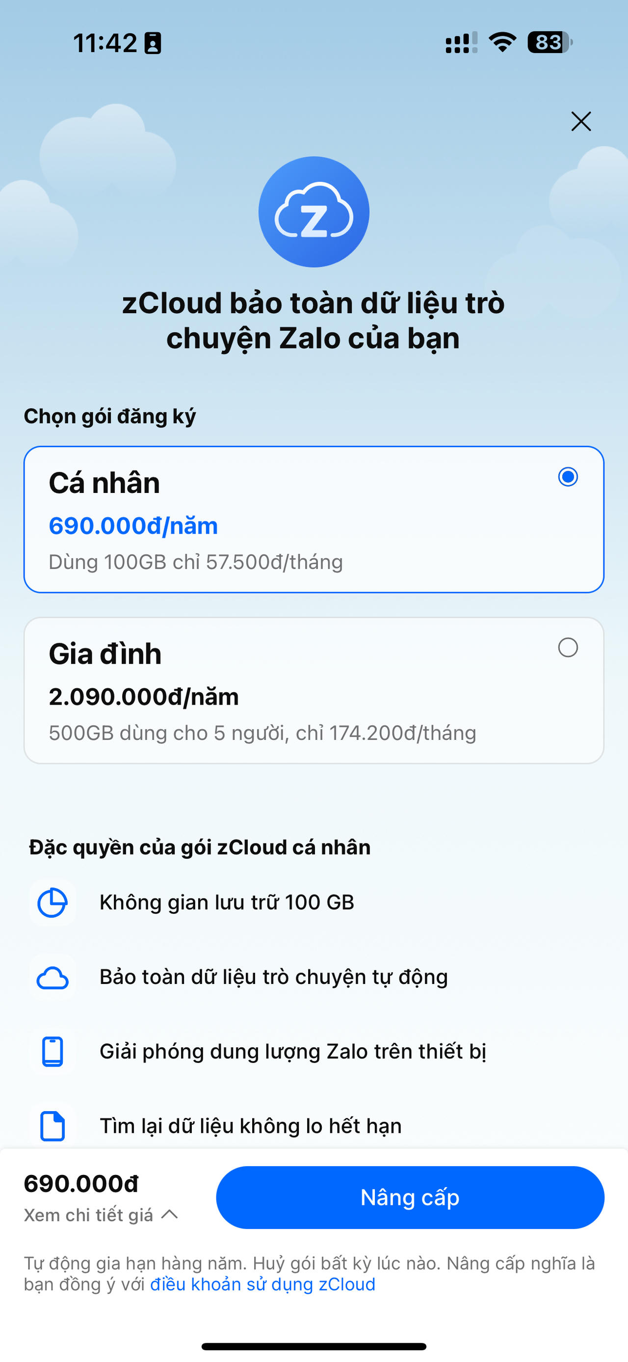 Các đặc quyền của gói Zcloud cá nhân gồm: không gian lưu trữ 100GB, bảo toàn dữ liệu trò chuyện tự động, giải phóng dung lượng Zalo trên thiết bị, tìm lại dữ liệu không lo hết hạn.