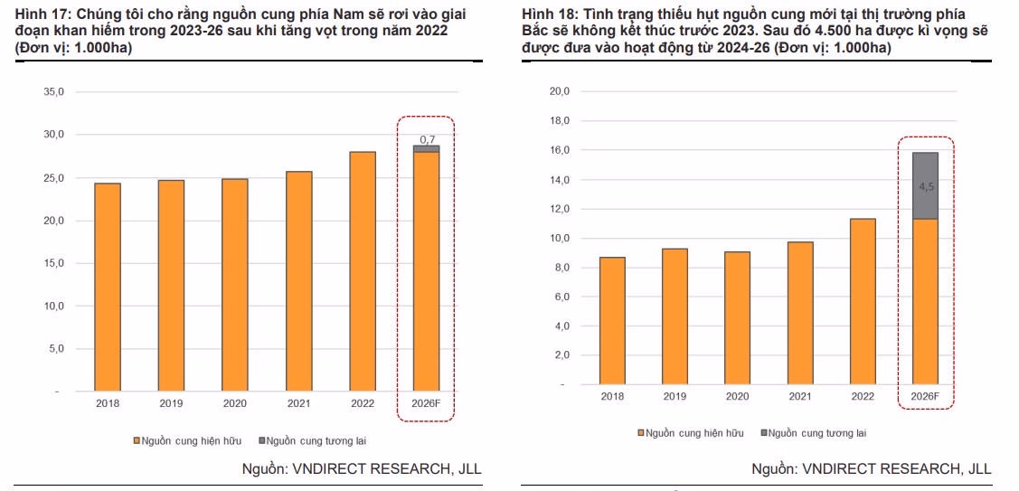 VnDirect nhận định, thị trường BĐS KCN sẽ đối mặt với tình trạng khan hiếm nguồn cung mới từ nay đến cuối năm 2023. Sau khi nguồn cung tăng vọt trong năm 2022, chỉ có khoảng 700ha đất được đưa vào sửa dụng ở miền Nam trong giai đoạn 2023-26, chủ yếu là ở Long An và Đồng Nai. Trong khi đó mặc dù có nhiều dự án đang chờ được phê duyệt, chúng tôi cho rằng tình trạng thiếu nguồn cung mới tại thị trường phía Bắc sẽ kéo dài ít nhất cho tới hết năm 2023. Sau đó, chúng tôi kỳ vọng khoảng 4.500ha sẽ được đưa vào hoạt động từ 2024-26 với nguồn cung lớn nhất đến từ Bắc Ninh và Hải Phòng.