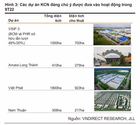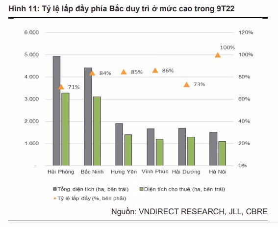 Còn tại thị trường phía Bắc chỉ ghi nhận 2 dự án mới đi vào hoạt động là KCN Thuận Thành 1 tại Bắc Ninh và KCN An Phát 1 tại Hải Dương với diện tích cho thuê lần lượt là 160ha và 130ha, dẫn đến diện tích cho thuê toàn thị trường tăng 2,5% svck (khoảng 11.333ha). Tổng diện tích đất công nghiệp trong 9T22 tăng 2,7% svck lên 16.072 ha trong khi tỷ lệ lấp đầy tăng 4,7 điểm % svck lên 80-82% vào cuối Q3/22.