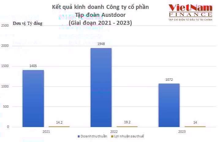 Về kết quả kinh doanh, giai đoạn 2021-2023 chứng kiến sự thăng giáng về doanh thu của Austdoor. Cụ thể, năm 2021 doanh thu thuần của doanh nghiệp đạt mức 1.405 tỷ đồng; năm tiếp theo tăng thêm 40% lên mức 1.948 tỷ đồng. Dù vậy, kết thúc năm 2023, doanh thu thuần của Austdoor lại giảm xuống còn 1.072 tỷ đồng, tương đương mức giảm 45% so với cùng kỳ.