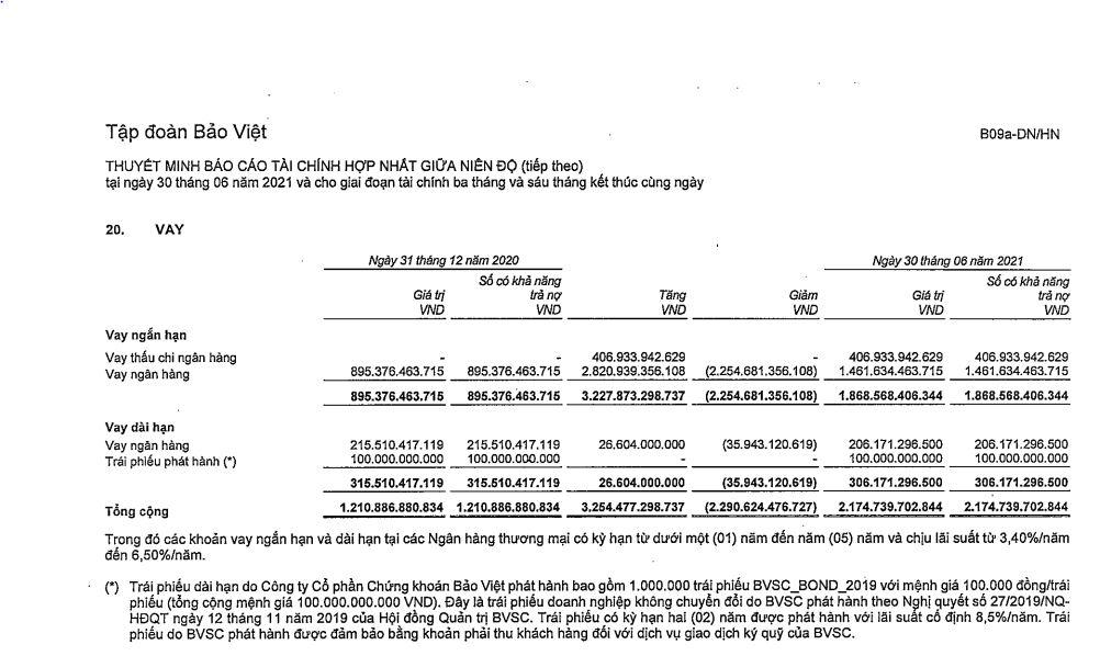 Đáng chú ý, trong tổng nợ phải trả, dư nợ đi vay ngắn hạn tại BVH tăng vọt 109% so với đầu năm, lên mức hơn 1.868 tỷ đồng. Nợ đi vay dài hạn ngân hàng ghi nhận hơn 206 tỷ đồng và phát hành trái phiếu ở mức 100 tỷ đồng. Tuy nhiên, phần thuyết minh báo cáo tài chính không nêu cụ thể các khoản vay từ ngân hàng nào.