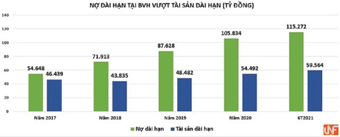 Cụ thể, tại ngày 30/6/2021, nợ dài hạn ghi nhận hơn 115.272 tỷ đồng, tăng 9% so với đầu năm. Trong khi đó, chủ yếu là dự phòng nghiệp vụ bảo hiểm (114.681 tỷ đồng) và phải trả dài hạn khác (gần 281 tỷ đồng). Trong khi đó, tài sản dài hạn tại thời điểm này chỉ có 59.564 tỷ đồng. Như vậy, nợ dài hạn cao gấp 2 lần tài sản dài hạn tại BVH.