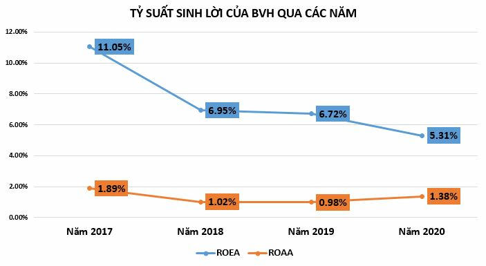 Cụ thể, chỉ số ROEA tại BVH (tỷ suất lợi nhuận trên vốn chủ sở hữu bình quân) liên tục giảm trong giai đoạn 2017-2020, từ 11,05% năm 2017 xuống còn 5,31% năm 2020.