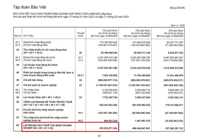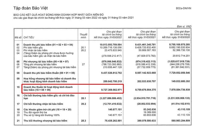 Tập đoàn Bảo Việt (HOSE: BVH) có tiền thân là Công ty Bảo hiểm Việt Nam (Bảo Việt) được thành lập với vốn điều lệ ban đầu là 10 triệu đồng được thành lập năm 1964. Theo báo cáo kết quả hoạt động của Tập đoàn Bảo Việt trong quý 1/2022, doanh thu thuần từ hoạt động kinh doanh bảo hiểm tính đến 31/03/2022 đạt gần 9,438 tỷ đồng, tăng 10,2% so với cùng kỳ năm 2021 (quý 1/2021 đạt 8,557 tỷ đồng). Lợi nhuận sau thuế thu nhập doanh nghiệp đạt gần 511 tỷ đồng.