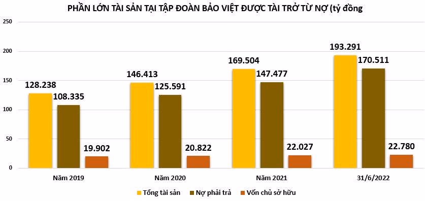 Tổng tài sản tại Bảo Việt ghi nhận tại BCTC quý II hơn 193.291 tỷ đồng, tăng 14% so với đầu năm được hình thành từ 170.510 tỷ đồng nợ phải trả, tương đương tỷ số nợ phải trả trên tổng tài sản là 88% và chỉ có 22.780 tỷ đồng vốn chủ sở hữu. Do đó, nợ phải trả đang cao gấp 7,4 lần vốn chủ sở hữu.
