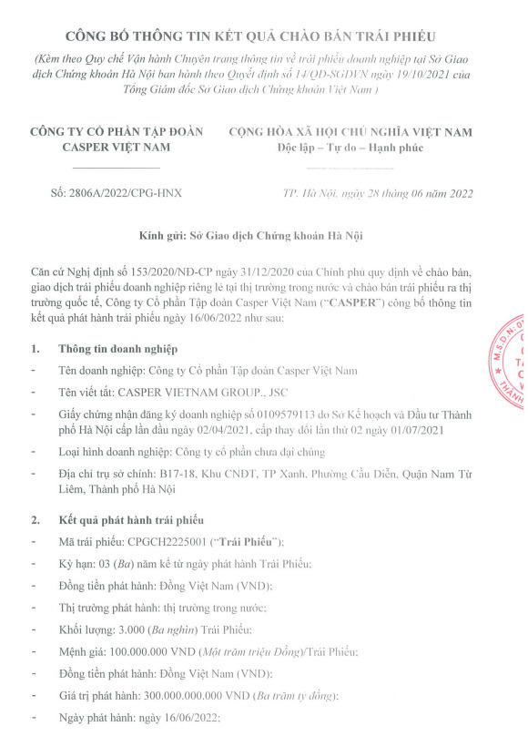 CTCP Tập đoàn Casper Việt Nam (tên viết tắt Casper Việt Nam Group) vào ngày 16/6/2022 đã phát hành 300 tỷ đồng trái phiếu kỳ hạn 3 năm. Chi tiết về thương vụ không được công bố.