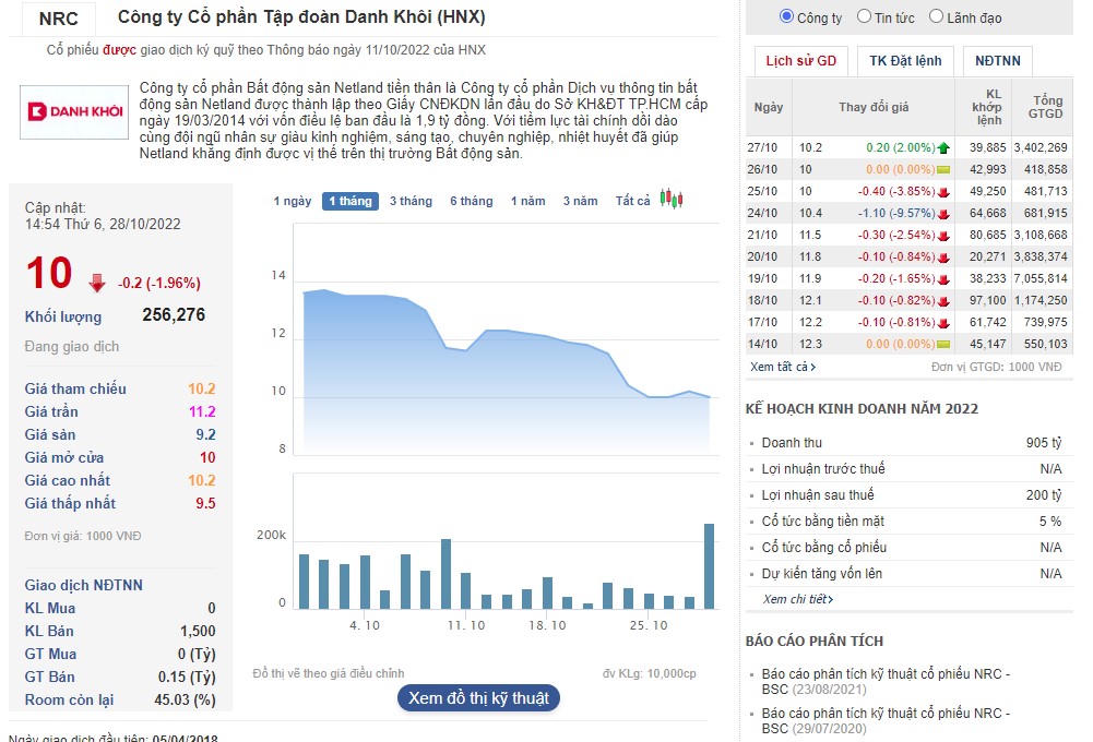 Trên thị trường chứng khoán, cổ phiếu NRC của Tập đoàn Danh Khôi đã giảm tới 68% kể từ đỉnh. Theo đó, kết phiên giao dịch cuối tuần ngày 28/10/2022, thị giá cổ phiếu NRC giao dịch ở mức 10.000 đồng/cổ phiếu.