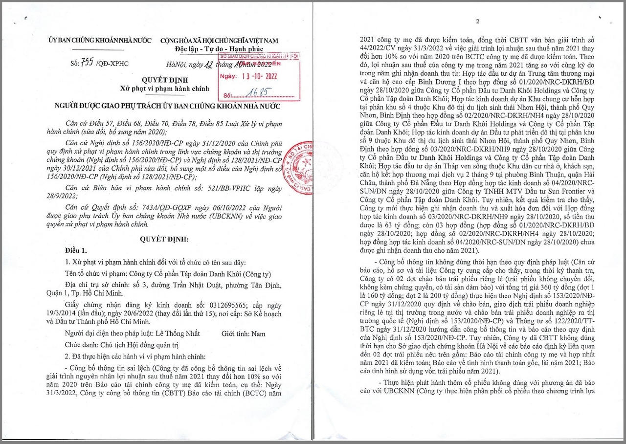 Ủy ban Chứng khoán Nhà nước vừa ban hành Quyết định số 755/QĐ-XPVPHC ngày 12/10/2022 về việc xử phạt vi phạm hành chính trong lĩnh vực chứng khoán và thị trường chứng khoán đối với Công ty cổ phần Tập đoàn Danh Khôi.