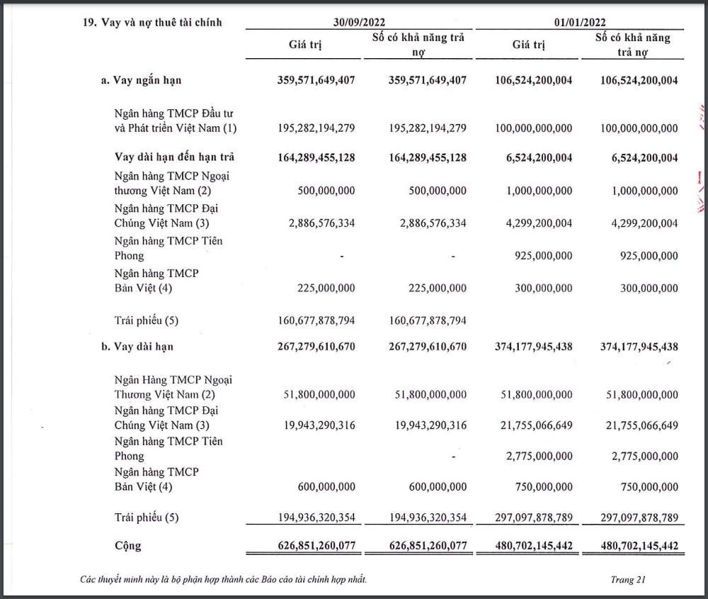 Theo thuyết minh của Danh Khôi, khoản vay ngắn hạn tính đến cuối quý III/2022 của công ty là 359,6 tỷ đồng. Trong đó vay Ngân hàng Thương mại cổ phần Đầu tư và Phát triển Việt Nam (BIDV) 195,3 tỷ đồng, tăng 95 tỷ đồng so với đầu năm, khoản vay này được chia làm các hợp đồng tín dụng với thời hạn từ 8-10 tháng, lãi suất từ 7,5 – 8,7% và được thế chấp bằng quyền sử dụng đất và tài sản gắn liền với đất của bên thứ ba. Còn lại 164,3 tỷ đồng đến từ khoản vay dài hạn đến hạn trả, trong đó chủ yếu là khoản vay trái phiếu với 160,7 tỷ đồng.