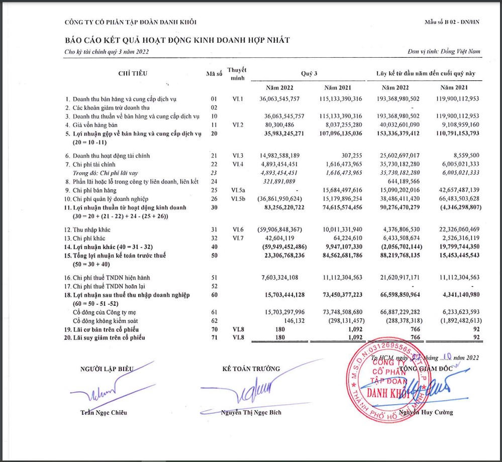Lũy kế 9 tháng đầu năm 2022, Danh Khôi ghi nhận khoản doanh thu tăng khoảng 74 tỷ đồng so với cùng kỳ lên 193 tỷ đồng. Lợi nhuận cổ đông công ty mẹ cũng ghi nhận tăng mạnh lên gần 67 tỷ đồng (trong khi cùng kỳ năm 2021 chỉ là 6,2 tỷ đồng).