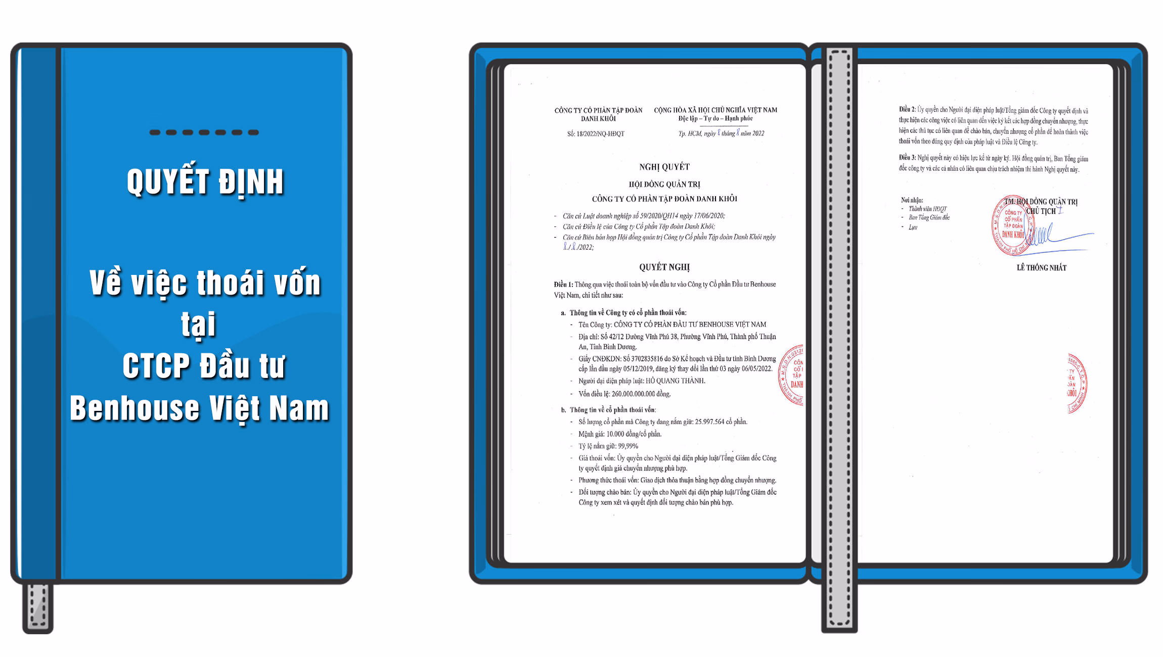 Sau đó, Danh Khôi đã hoàn tất việc nhận chuyển nhượng cổ phần tại Benhouse với tỷ lệ sở hữu tại ngày mua là 99,99% vốn điều lệ, tương đương gần 26 triệu cổ phần vào tháng 5/2022, đồng thời ghi nhận Benhouse là công ty con trong báo cáo tài chính quý II/2022.