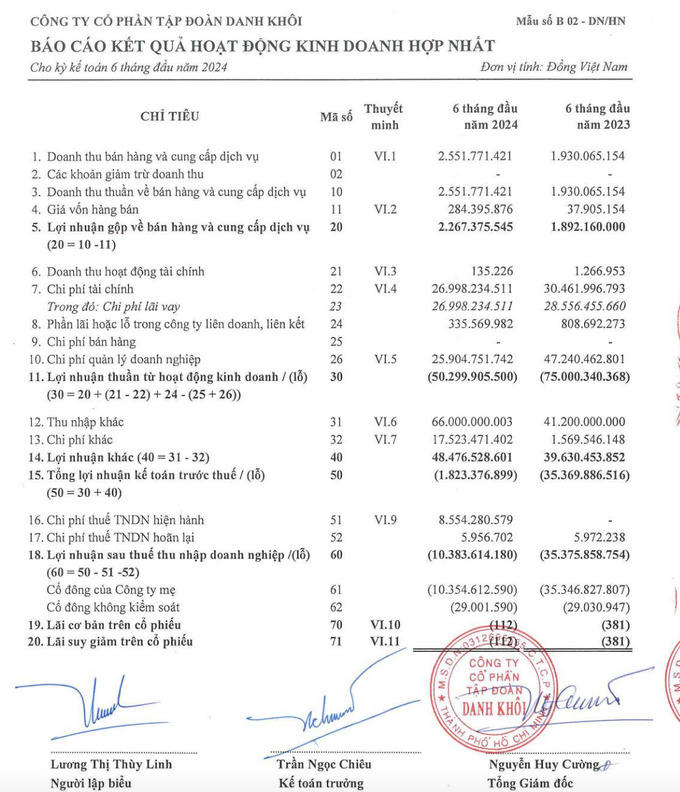 Kết quả, doanh nghiệp này chuyển lãi thành lỗ sau soát xét với điều chỉnh ghi nhận lỗ sau thuế hơn 10 tỷ đồng trong khi báo cáo tự lập trước đó Tập đoàn Danh Khôi báo lãi 7,1 tỷ đồng (cùng kỳ lỗ 35,4 tỷ).
