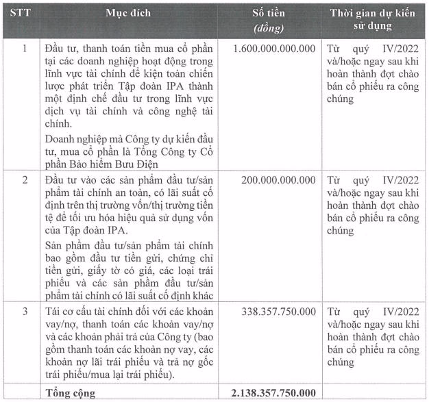 Nếu phát hành thành công, tổng số tiền huy động dự kiến là 2.138,3 tỷ đồng. Trong đó, Công ty dự kiến dùng 1.600 tỷ đồng mua cổ cổ phần của Tổng CTCP Bảo hiểm Bưu Điện; 338,4 tỷ đồng tái cơ cấu tài chính đối với khoản vay/nợ, thanh toán các khoản vay/nợ và các khoản phải trả; và 200 tỷ đồng đầu tư vào các sản phẩm đầu tư/sản phẩm tài chính an toàn, có lãi suất cố định trên thị trường vốn/thị trường tiền tệ để tối ưu hóa hiệu quả sử dụng vốn.