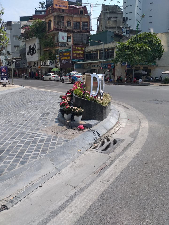 Đài phun nước mini và hàng chữ nổi này được lắp ráp, xây dựng kiên cố với chiều dài khoảng hơn 2m, cao khoảng 70cm đến gần 1m, chiều rộng khoảng hơn 50cm, nằm “chình ình” trên vỉa hè tại điểm giao của ngã tư đường Lê Duẩn giao với đường Nguyễn Thái Học.