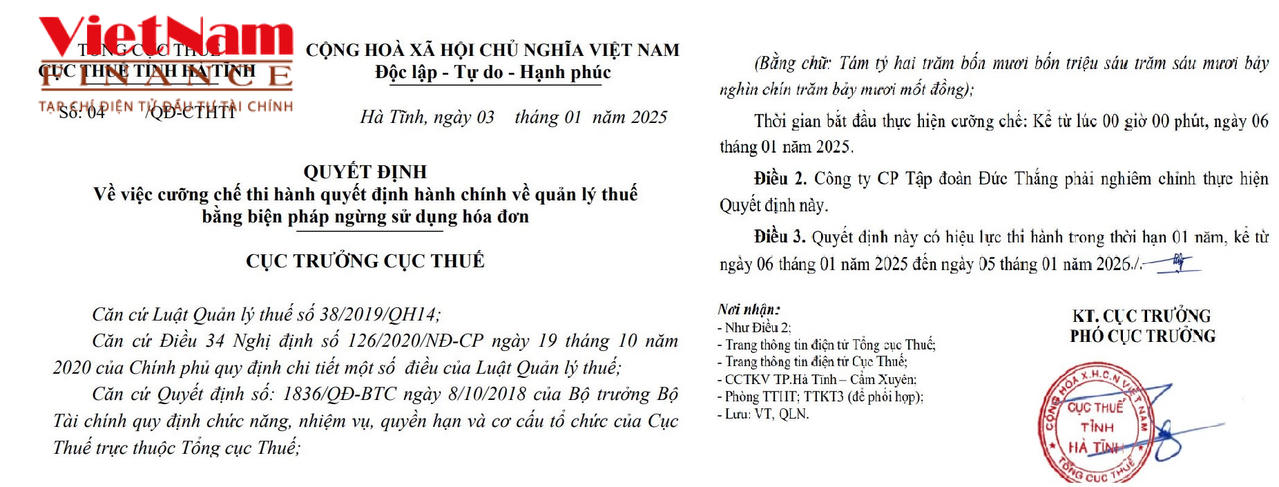 Nhiều tháng tiếp theo, Công ty CP Tập đoàn Đức Thắng vẫn nợ tiền thuế và các khoản thu khác thuộc ngân sách nhà nước và Cục Thuế tỉnh Hà Tĩnh ra quyết định cưỡng chế thi hành quyết định hành chính về quản lý thuế bằng biện pháp ngừng sử dụng hóa đơn.