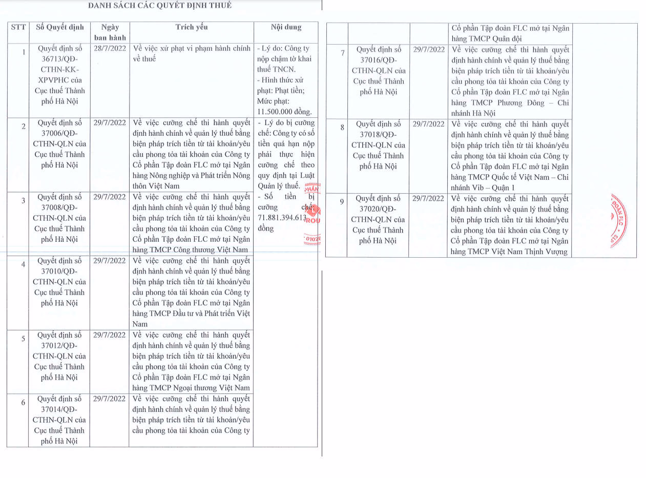 Trong đó, FLC bị phạt 11.5 triệu đồng do công ty nộp chậm tờ khai thuế TNCN tại quyết định số 36713/QĐ-CTHN-KK-XPVPHC ngày 28/7/2022. Tại quyết định số 37006/QĐ-CTHN-QLN ban hành ngày 29/7/2022 về việc cưỡng chế thi hành quyết định hành chính về quản lý thuế bằng biện pháp trích tiền từ tài khoản, yêu cầu phong tỏa tài khoản của FLC mở tại ngân hàng Agribank, BIDV, Vietcombank, MB, OCB, VIB và VPBank. Tổng số tiền bị cưỡng chế là 71,88 tỷ đồng. Do công ty có số tiền quá hạn nộp phải thực hiện cưỡng thế theo quy định tại Luật Quản lý thuế.