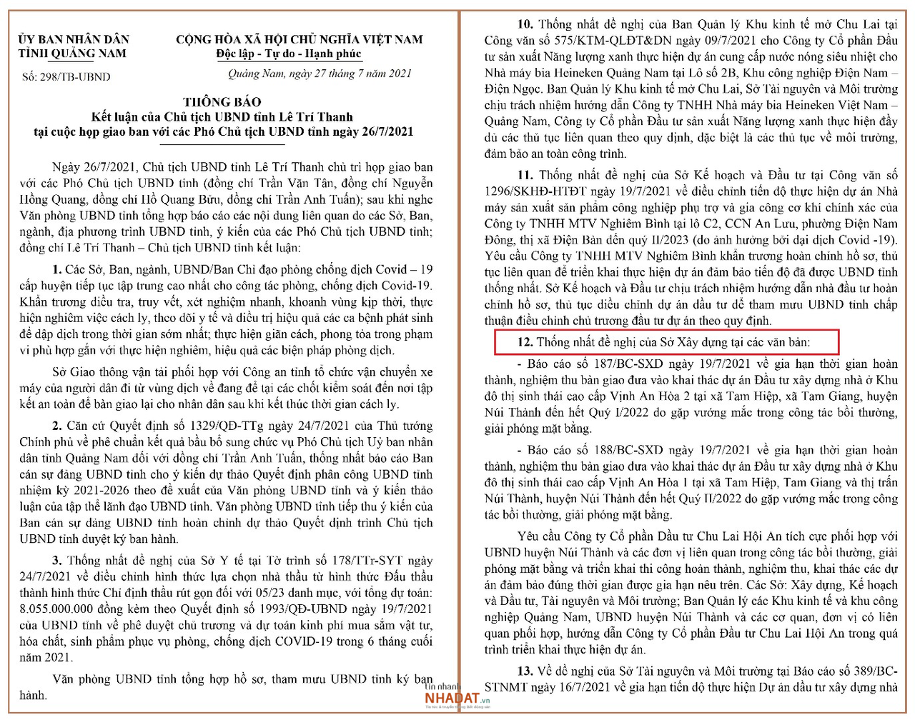 Mới đây, Văn phòng UBND tỉnh Quảng Nam đã thông báo kết luận của Chủ tịch UBND Lê Trí Thanh sau cuộc họp ban với các phó Chủ tịch UBND tỉnh. Theo văn bản được ban hành có nội dung về việc dự án Vịnh An Hoà 1 và 2 do Công ty Cổ phần đầu tư Chu Lai Hội An, đơn vị thành viên Tập đoàn FVG làm chủ đầu tư được gia hạn đến giữa năm 2022.