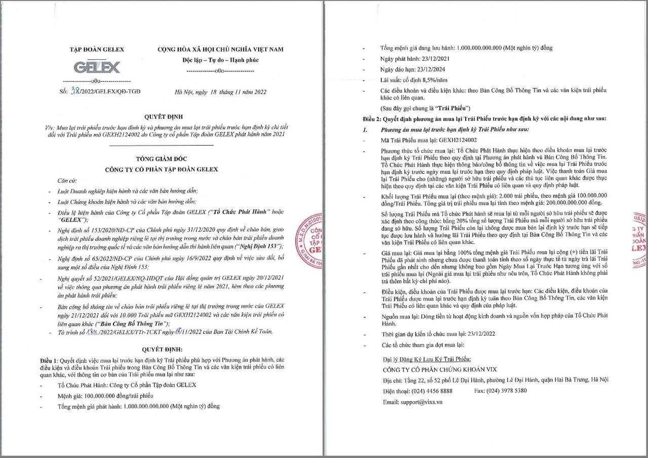 Thời gian dự kiến mua lại ngày 23/12/2022. Được biết, trái phiếu mã GEXH2124002 phát hành ngày 23/12/2021 và đáo hạn ngày 23/12/2024, lãi suất cố định 8,5%/năm. Tổng giá trị của lô trái phiếu này là 1.000 tỷ đồng. Như vậy, nếu mua thành công, lô trái phiếu GEXH2124002 sẽ còn lại 800 tỷ đồng.
