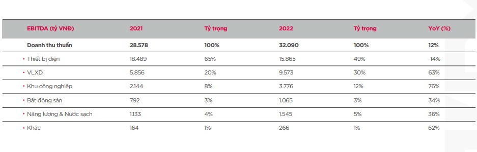 Tỷ trọng doanh thu 2022 cân bằng hơn giữa các mảng kinh doanh, giảm phụ thuộc vào mảng thiết bị điện so với cùng kỳ 2021 do hợp nhất Viglacera từ quý 2 năm 2021 và các mảng khu công nghiệp, bất động sản, vật liệu xây dựng, năng lượng đều tăng trưởng tốt trong năm 2022.