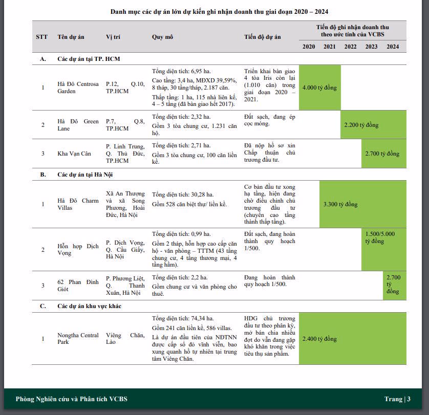 Cũng theo VNDirect, trong năm 2021, HDG có kế hoạch mở bán 2 dự án BĐS dân cư là Green Lane (quận 8, TP.HCM) và Hado Minh Long (TP Thủ Đức, TP.HCM), “tuy nhiên, do thủ tục pháp lý của các dự án trên vẫn chưa được hoàn thiện, chúng tôi tạm thời chưa bổ sung các dự án này vào mô hình dự phóng kết quả kinh doanh năm 2021 – 2023”.