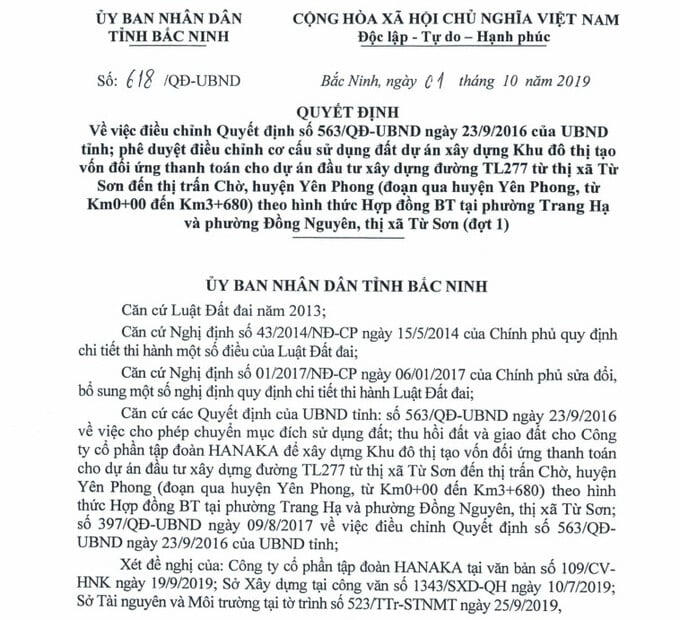 Ngày 01/10/2019, UBND tỉnh Bắc Ninh đã ban hành quyết định chấp thuận nhà đầu tư CTCP Tập đoàn Hanaka (người đại diện theo pháp luật là ông Mẫn Ngọc Anh - Chủ tịch Hội đồng quản trị) thực hiện đầu tư dự án khu đô thị để tạo vốn đối ứng thanh toán cho dự án đầu tư xây dựng đường TL277 từ thị xã Từ Sơn đến thị trấn Chờ, huyện Yên Phong theo hình thức hợp đồng BT (tên thương mại là Hanaka Paris Ocean Park).
