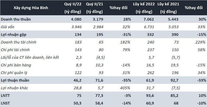 Tại kỳ báo cáo tài chính quý II/2022 cho thấy, trong nửa đầu năm 2022, giữa thời điểm tình hình kinh tế vĩ mô gặp nhiều biến động trong bối cảnh dịch bệnh Covid-19 vẫn còn hoành hành, giá cả nguyên vật liệu đầu vào tăng cao thì Hòa Bình vẫn duy trì được nhịp điệu tăng trưởng doanh thu 28% so với cùng kỳ.