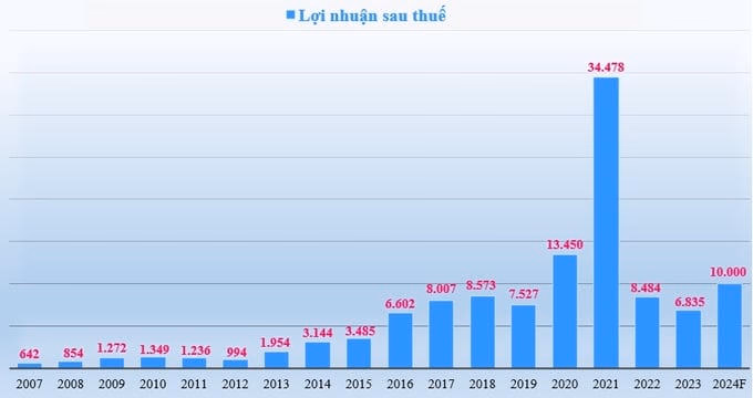 Lợi nhuận sau thuế cổ đông công ty mẹ (tỷ đồng) của Hòa Phát giai đoạn 2007-2023 và kế hoạch 2024.