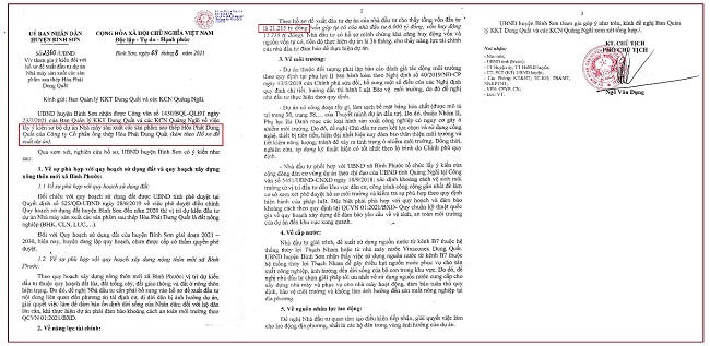 UBND huyện Bình Sơn cho hay, nhà đầu tư có hồ sơ chứng minh khả năng huy động vốn và nguồn vốn tự có, tiến độ thực hiện là 36 tháng cho thấy năng lực tài chính đảm bảo thực hiện dự án. Đồng thời yêu cầu Hòa Phát cam kết lựa chọn và sử dụng công nghệ, thiết bị tiên tiến, hiện đại nhất hiện nay để tránh gây ô nhiễm môi trường,…