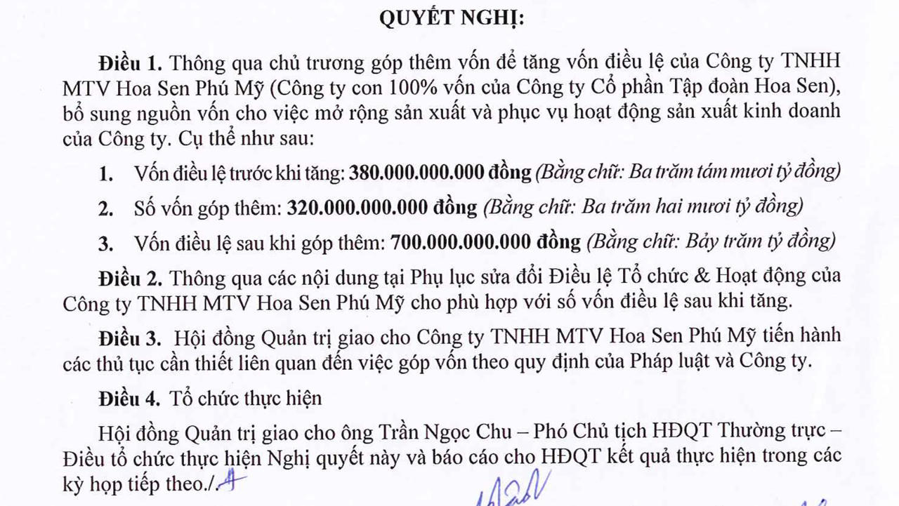 Ngày 22/11 vừa qua, Công ty CP Tập đoàn Hoa Sen (HoSE: HSG) đã công bố nghị quyết thông qua việc góp thêm 320 tỷ đồng để tăng vốn điều lệ của Công ty TNHH MTV Hoa Sen Phú Mỹ lên mức 700 tỷ đồng. Đây là công ty con do Tập đoàn Hoa Sen sở hữu 100% vốn điều lệ.