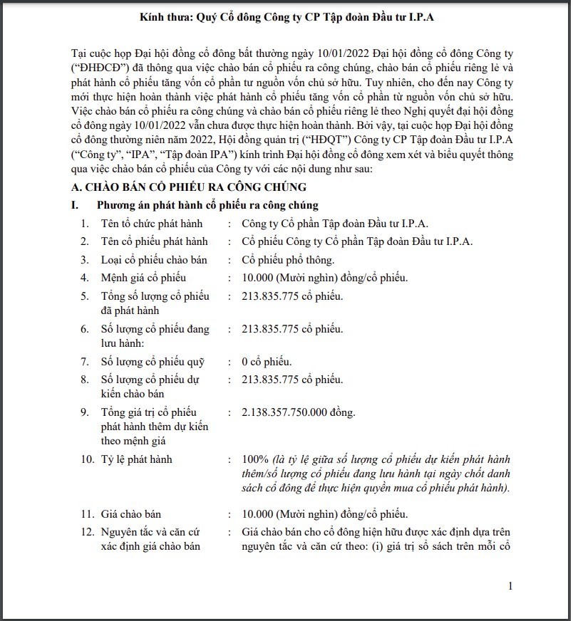 Tại Đại hội đồng cổ đông (ĐHĐCĐ) thường niên 2022 của IPA diễn ra trước đó, doanh nghiệp đã trình phương án chào bán 213.835.795 cổ phiếu cho cổ đông hiện hữu.