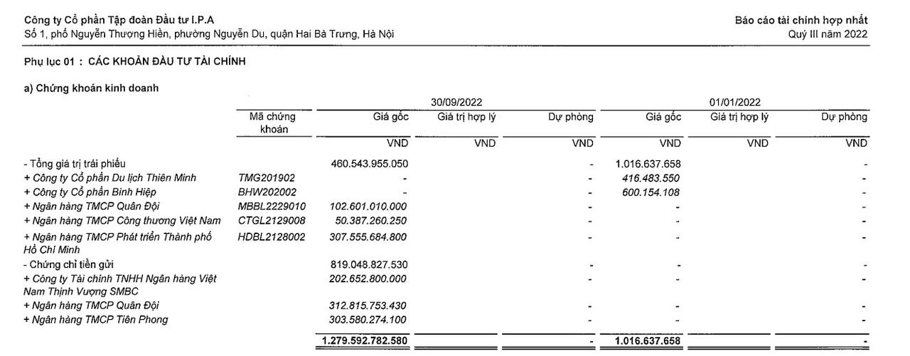 Đáng chú ý, tại ngày 30/9/2022, IPA có 1.280 tỷ đồng chứng khoán kinh doanh. Trong đó, có 819 tỷ đầu tư vào chứng chỉ tiền gửi và gần 461 tỷ đồng đầu tư vào trái phiếu của các ngân hàng TMCP. Ngoài ra, doanh nghiệp có 52 tỷ đồng tiền, tương đương tiền cuối kỳ.