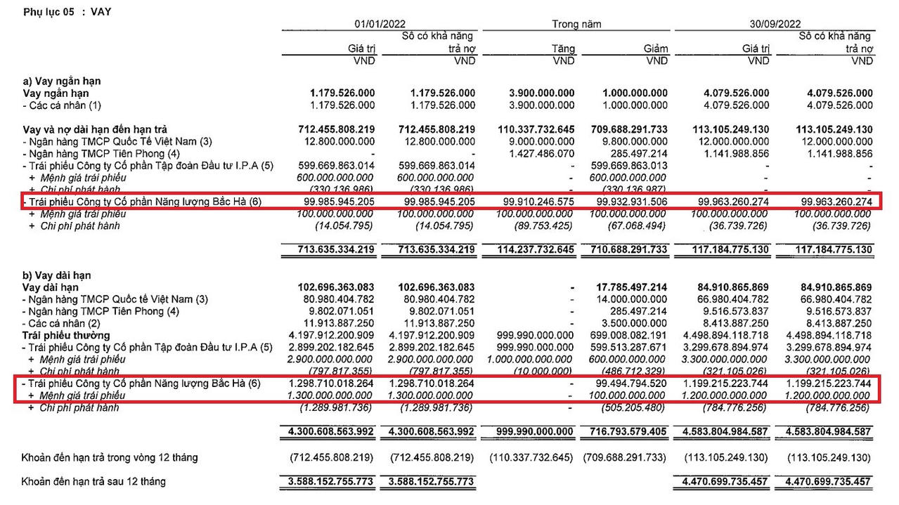 Về tổng nguồn vốn, đến ngày 30/9/2022 chiếm phần lớn là khoản vay nợ với gần 4.588 tỷ đồng. Trong đó, dư nợ trái phiếu đến hạn phải trả là 100 tỷ đồng. Khoản huy động trái phiếu của tập đoàn là 3.300 tỷ còn 1.200 tỷ là trái phiếu huy động cho công ty con là CTCP Năng lượng Bắc Hà.