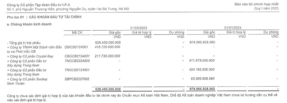 Như đề cập ở trên khoản đầu tư tài chính dài hạn của IPA ghi nhận 4.198 tỷ đồng, chiếm đến gần 50% tổng tài sản. Trong đó, IPA đã bán ra 511,7 tỷ đồng trái phiếu của CTCP Đầu tư Xây dựng Trung Nam mã TNGCB2224003; 404,2 tỷ đồng trái phiếu CTCP Đầu tư Xây dựng Trung Nam mã TNGCB2124001; và 64 tỷ đồng trái phiếu CTCP Sunbay Ninh Thuận mã SBPC2227002.