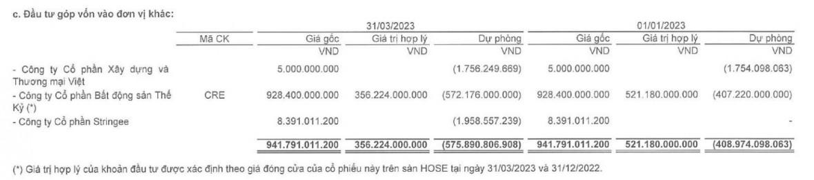 Đáng chú ý, tính tới cuối quý I/2023, Đầu tư I.P.A ghi nhận đang đầu tư góp vốn vào CTCP Bất động sản Thế Kỷ (mã CK: CRE) với giá trị 928,4 tỷ đồng, trích lập dự phòng 572,2 tỷ đồng, tương ứng tạm lỗ 61,6% tổng giá trị đầu tư vào cổ phiếu CRE.