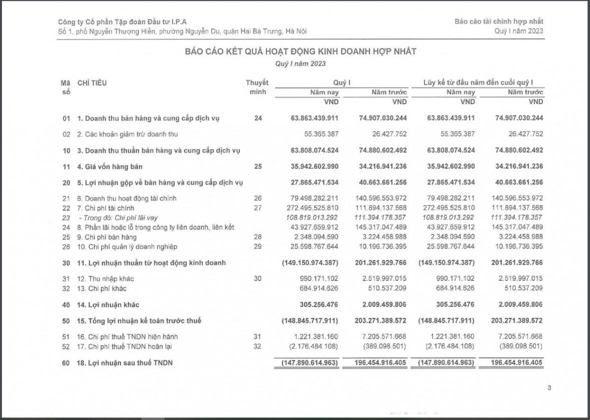 Cụ thể, Báo cáo tài chính hợp nhất quý I/2023 của IPA cho thấy, trong quý đầu năm 2023, doanh nghiệp ghi nhận doanh thu thuần đạt gần 63,81 tỷ đồng, giảm 14,8% so với cùng kỳ.