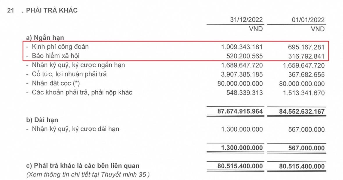 Cụ thể, tại Báo cáo tài chính hợp nhất quý IV/2022 của Công ty Cổ phần Tập đoàn Đầu tư I.P.A (Mã CK: IPA) chỉ ra, tính đến ngày 31/12/2022, doanh nghiệp còn hơn 48 tỷ đồng tiền nợ nhân viên. Trong đó, tiền lương phải trả cho người lao động là 2,1 tỷ đồng (tăng khoảng 300 triệu so với thời điểm đầu năm 2022); tiền khen thưởng và phúc lợi là 44,4 tỷ đồng (tăng khoảng 12 tỷ so với đầu năm 2022); ngoài ra còn có phí công đoàn là hơn 1 tỷ và bảo hiểm xã hội hơn 520 triệu.