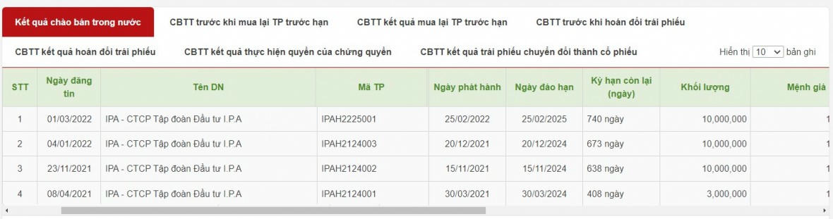 Cụ thể, theo thống kê trên Sở Giao dịch chứng khoán Hà Nội (HNX), từ tháng 3/2021 đến tháng 2/2022, IPA đã huy động 3.300 tỷ đồng trái phiếu, không đảm bảo bằng tài sản, không phải khoản nợ thứ cấp, không kèm chứng quyền, không chuyển đổi.