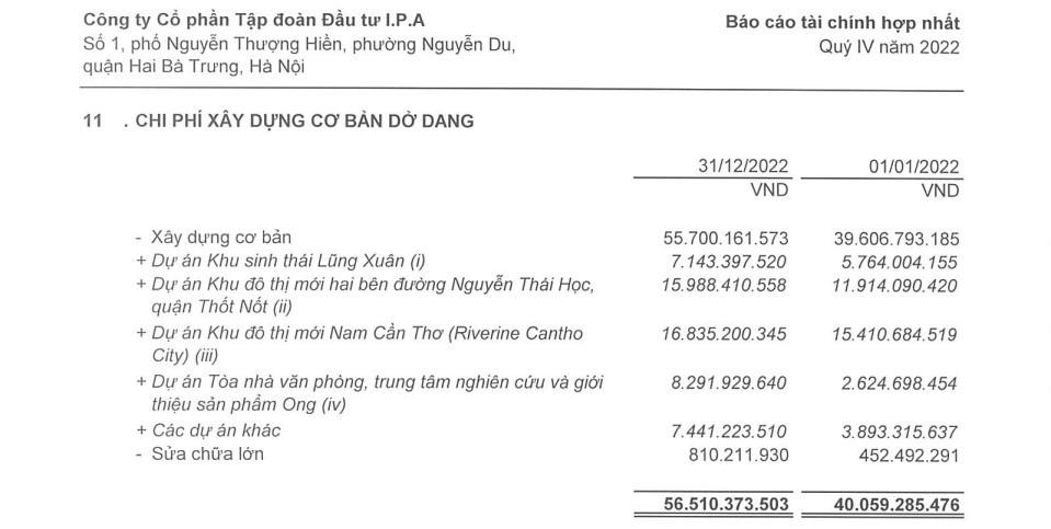 Một trong các lĩnh vực IPA tập trung là kinh doanh bất động sản thông qua các công ty Bất động sản Anvie, Đầu tư Phát triển Lũng Xuân, Đầu tư và Phát triển Nam Cần Thơ, thế nhưng ghi nhận tại ngày 31/12/2022, chi phí xây dựng dở dang của các dự án chỉ hơn 56,5 tỷ đồng, tăng hơn 10 tỷ so với ngày đầu năm.