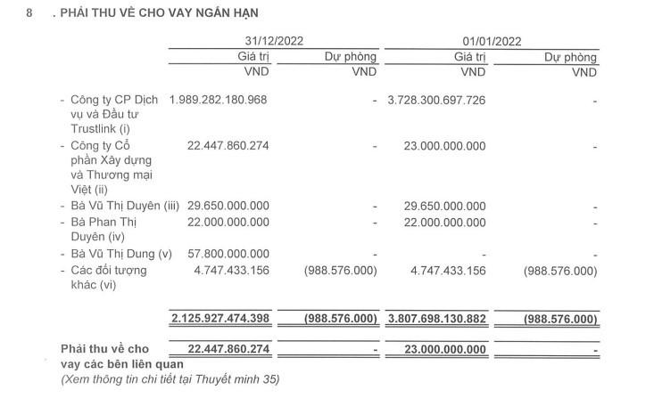 Các khoản phải thu ngắn hạn của IPA tính đến cuối quý năm 2022 là 2.298 tỷ đồng, trong đó hầu như là là phải thu về cho vay ngắn hạn từ CTCP Dịch vụ và Đầu tư Trustlink , cũng là đơn vị mật thiết và cũng là “con nợ” lớn nhất của IPA trong nhiều năm qua. Khoản vay lớn nhất giữa hai doanh nghiệp này là vào cuối năm 2021 khi Trustlink vay IPA 3.728 tỷ đồng (toàn bộ là khoản vay ngắn hạn).
