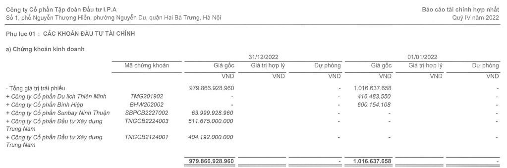 Cụ thể, theo thuyết minh trong báo cáo tài chính hợp nhất quý IV/2022 của IPA, doanh nghiệp đã dùng 979 tỷ đồng đầu tư vào trái phiếu của CTCP Đầu tư Xây dựng Trung Nam và CTCP Sunbay Ninh Thuận.