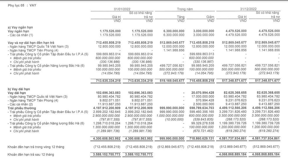 Tại danh mục vay dài hạn, IPA vay Ngân hàng TMCP Quốc tế Việt Nam (VIB) 64 tỷ đồng và Ngân hàng TMCP Tiên Phong (TPBank) 9,2 tỷ đồng. Ngoài ra, chủ yếu là khoản vay trái phiếu do IPA và Năng lượng Bắc Hà phát hành với giá trị lần lượt là 3.300 tỷ đồng và 1.200 tỷ đồng. Lãi suất các lô trái phiếu như trên là 10,5%/năm.
