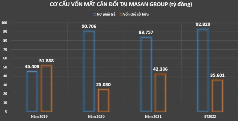 Cụ thể, tính đến cuối quý 3/2022, nợ phải trả tại Masan Group ghi nhận hơn 92.829 tỷ đồng, tăng gần 9.073 tỷ đồng, tương đương tăng 11% so với đầu năm (bao gồm: nợ ngắn hạn hơn 63.610 tỷ đồng và nợ dài hạn ghi nhận 29.219 tỷ đồng). Trong khi đó, vốn chủ sở hữu lại giảm 16% so với đầu năm, còn 35.601 tỷ đồng. Do đó, kết thúc 9 tháng đầu năm 2022, hệ số nợ phải trả/vốn chủ sở hữu của Masan Group là 2,6 lần.