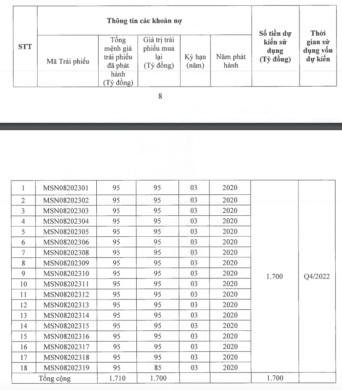 2.000 tỷ đồng còn lại sẽ được dùng để thanh toán một phần hoặc toàn bộ khoản gốc đến hạn của trái phiếu có mã MSN12003 với tổng mệnh giá 3.000 tỷ đồng, được phát hành ngày 12/5/2020 và đáo hạn 12/5/2023.