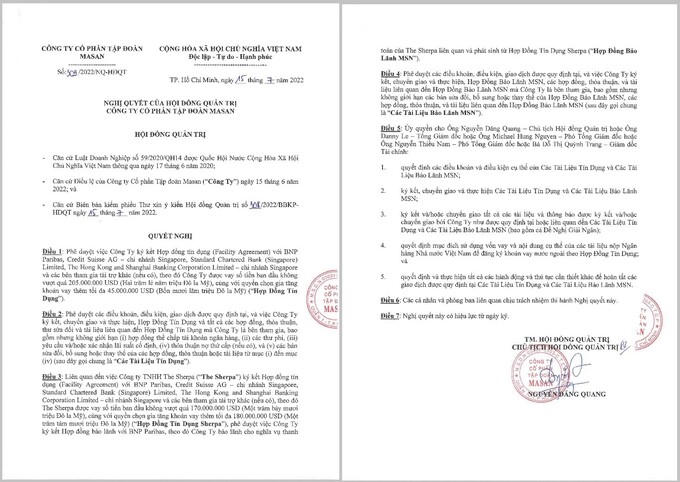 Ngoài ra, phê duyệt cho Công ty TNHH The Sherpa (The Sherpa - công ty con của Masan) ký kết hợp đồng tín dụng với các bên nêu trên. The Sherpa được vay tổng số tiền ban đầu không vượt quá 170 triệu USD, cùng với quyền chọn gia tăng khoản vay thêm tối đa 180 triệu USD. Đồng thời, Masan bảo lãnh cho nghĩa vụ thanh toán của The Sherpa liên quan và phát sinh từ Hợp đồng tín dụng The Sherpa.