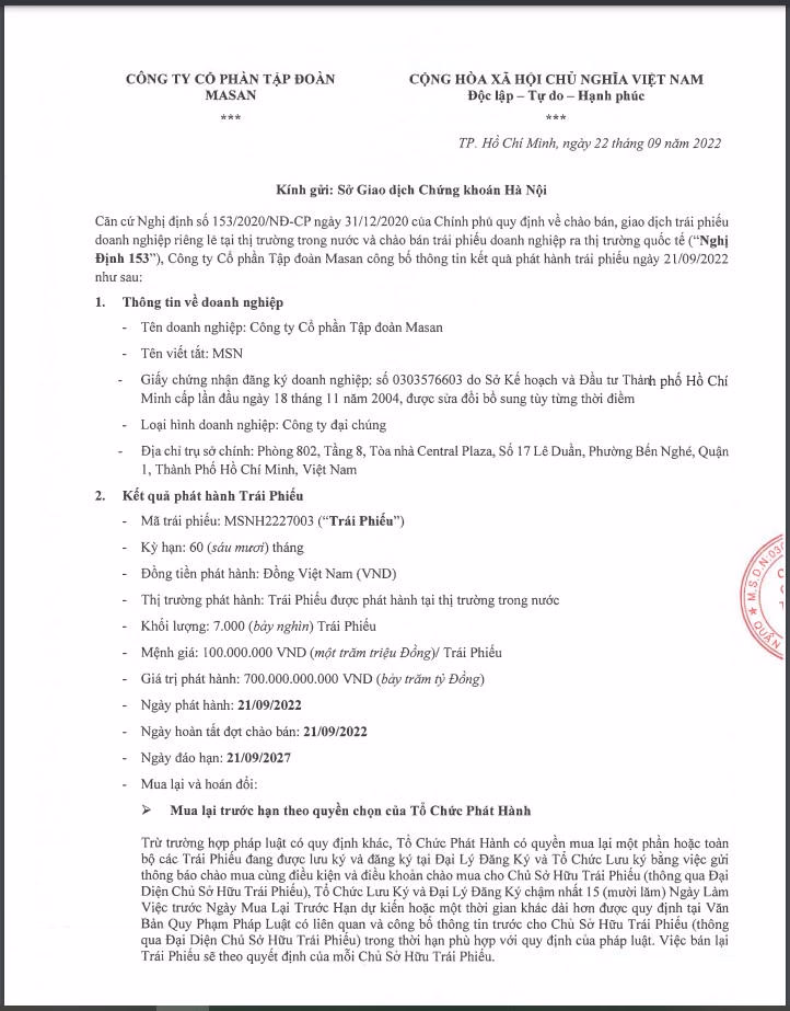 Các thông tin cơ bản khác như lãi suất, trái chủ mua trái phiếu và mục đích phát hành không được doanh nghiệ công bố. Tuy nhiên, theo thông tin được công bố trước đó, MSN đã công bố nghị quyết thay đổi phương án phát hành riêng lẻ 2 lô trái phiếu doanh nghiệp tổng trị giá 1.500 tỷ đồng cho nhà đầu tư chứng khoán chuyên nghiệp.