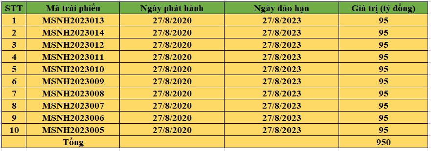 Hai lô trái phiếu có mã MSNH2328001 và MSNH2328002 với giá trị mỗi trái phiếu là 2.000 tỷ đồng, đều có kỳ hạn 60 tháng (5 năm) kể từ ngày phát hành với mệnh giá 100 triệu đồng/trái phiếu. Dự kiến 2 lô trái phiếu này sẽ được phát hành tương ứng trong quý 1/2023 và quý 2/2023.