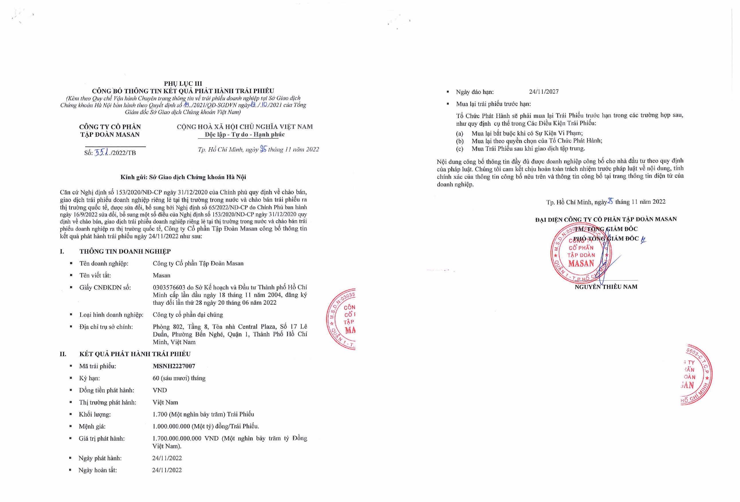 CTCP Tập đoàn Masan (mã CK: MSN) vừa phát hành thành công lô trái phiếu riêng lẻ có mã MSNH2227007 với tổng mệnh giá 1. 7 00 tỷ đồng.
