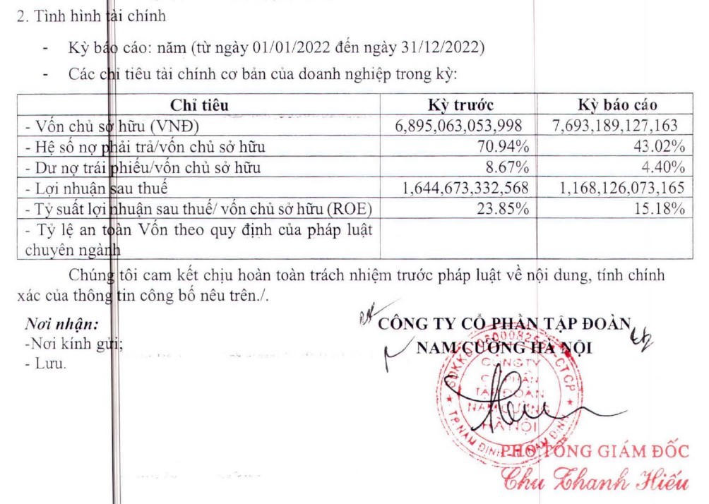 Theo thông tin trên Sở Giao dịch Chứng khoán Hà Nội (HNX), Công ty Cổ phần Tập đoàn Nam Cường Hà Nội đã công bố thông tin định kỳ về tình hình tài chính doanh nghiệp. Cụ thể, năm 2022, Tập đoàn Nam Cường đã thu về hơn 1.168 tỷ đồng lợi nhuận sau thế, con số này giảm nhẹ so với cùng kỳ năm ngoái. Nhưng, điểm đáng chú ý trong bản báo cáo này là tình hình nợ của doanh nghiệp đã được cắt giảm mạnh so với cùng kỳ.